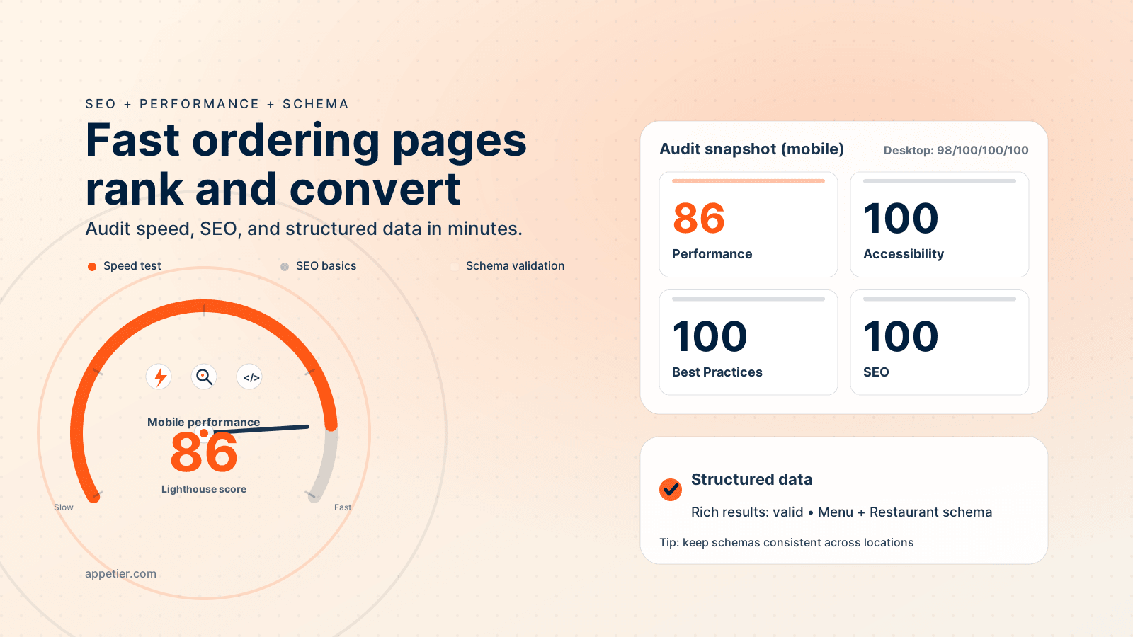 • Appetier storefronts ship with Lighthouse scores of 88/100/100/100 on mobile and 98/100/100/100 on desktop, with structured data baked in. Scores can vary by page, device, and network.